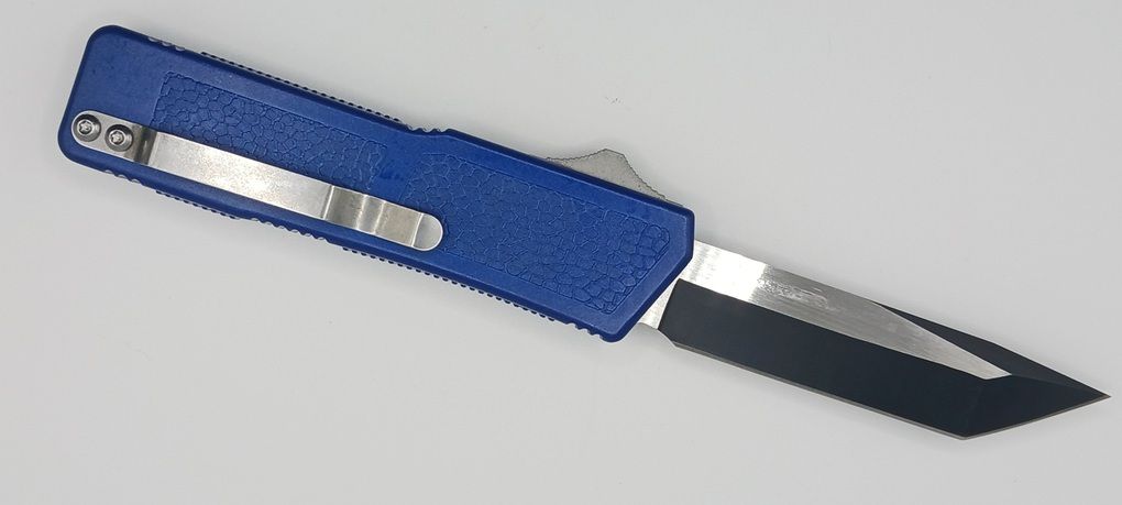 Lightning Supreme Blue D/A OTF Automatic Knife Tanto Point Two Tone Plain. The Blue Lightning Supreme has an 8 inch total length with a 3.25 inch blade. It is a double action in and out switchblade knife. This is a taiwan version. The taiwan version was the first produced before the chinese versions came out. This version has aircraft aluminum handles and better made metal blades. The springs in these are made better than the chinese versions. It comes with a pocket clip which can be taken off.