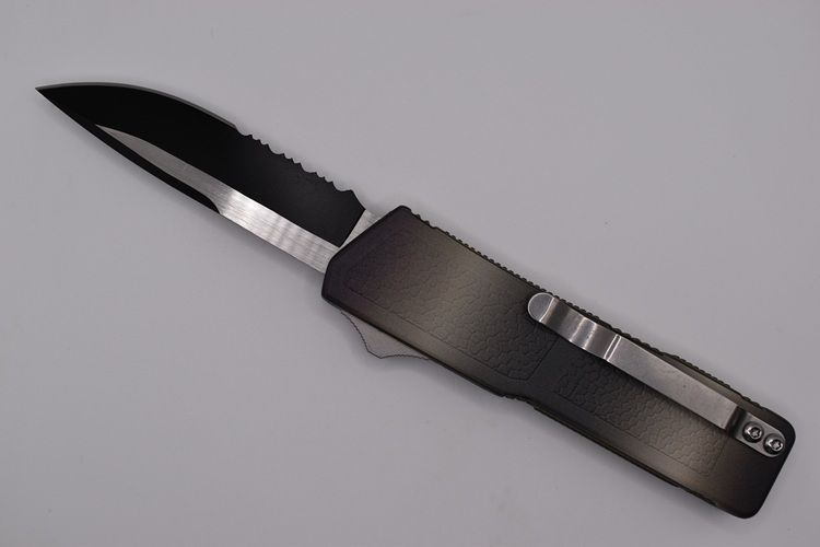 Lightning Supreme Camo D/A OTF Automatic Knife Drop Point Two Tone Serrated. The Camo Lightning Supreme has an 8 inch total length with a 3.25 inch blade. It is a double action in and out switchblade knife. This is a taiwan version. The taiwan version was the first produced before the chinese versions came out. This version has aircraft aluminum handles and better made metal blades. The springs in these are made better than the chinese versions. It comes with a pocket clip which can be taken off.