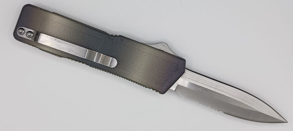 Lightning Supreme Camouflage D/A OTF Automatic Knife Dagger Point Satin Serrated. The Camouflage Lightning Supreme has an 8 inch total length with a 3.25 inch blade. It is a double action in and out switchblade knife. This is a taiwan version. The taiwan version was the first produced before the chinese versions came out. This version has aircraft aluminum handles and better made metal blades. The springs in these are made better than the chinese versions. It comes with a pocket clip which can be taken off.