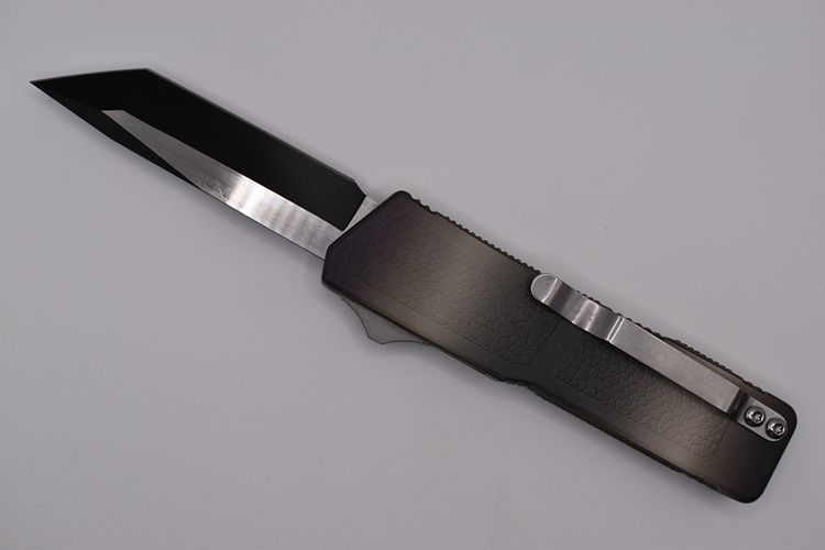 Lightning Supreme Camouflage D/A OTF Automatic Knife Tanto Point Two Tone. The Camouflage Lightning Supreme has an 8 inch total length with a 3.25 inch blade. It is a double action in and out switchblade knife. This is a taiwan version. The taiwan version was the first produced before the chinese versions came out. This version has aircraft aluminum handles and better made metal blades. The springs in these are made better than the chinese versions. It comes with a pocket clip which can be taken off.