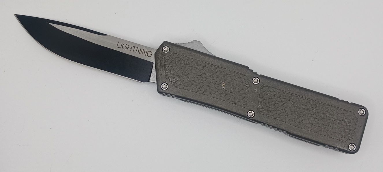 Lightning Supreme Gray D/A OTF Automatic Knife Drop Point Two Tone Plain. The Gray Lightning Supreme has an 8 inch total length with a 3.25 inch blade. It is a double action in and out switchblade knife. This is a taiwan version. The taiwan version was the first produced before the chinese versions came out. This version has aircraft aluminum handles and better made metal blades. The springs in these are made better than the chinese versions. It comes with a pocket clip which can be taken off.