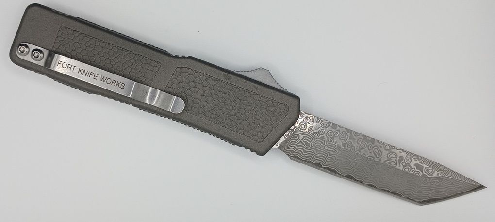 Lightning Supreme Gray D/A OTF Automatic Knife Tanto Point Damascus Plain. The Gray Lightning Supreme has an 8 inch total length with a 3.25 inch blade. It is a double action in and out switchblade knife. This is a taiwan version. The taiwan version was the first produced before the chinese versions came out. This version has aircraft aluminum handles and better made metal blades. The springs in these are made better than the chinese versions. It comes with a pocket clip which can be taken off.