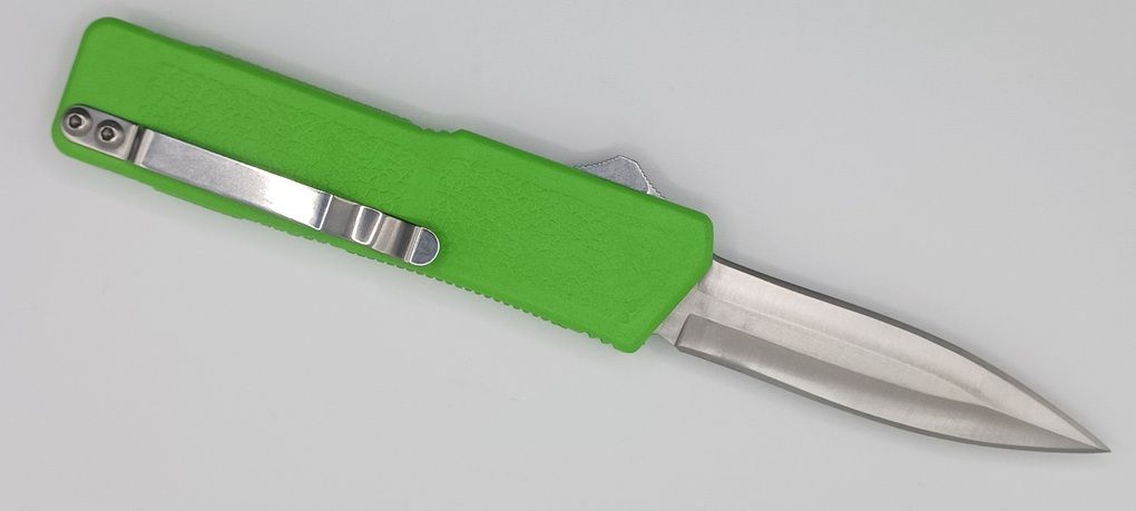 Lightning Supreme Green D/A OTF Automatic Knife Dagger Point Satin Plain. The Green Lightning Supreme has an 8 inch total length with a 3.25 inch blade. It is a double action in and out switchblade knife. This is a taiwan version. The taiwan version was the first produced before the chinese versions came out. This version has aircraft aluminum handles and better made metal blades. The springs in these are made better than the chinese versions. It comes with a pocket clip which can be taken off.