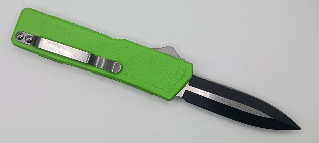 Lightning Supreme Green D/A OTF Automatic Knife Dagger Point Two Tone Plain. The Green Lightning Supreme has an 8 inch total length with a 3.25 inch blade. It is a double action in and out switchblade knife. This is a taiwan version. The taiwan version was the first produced before the chinese versions came out. This version has aircraft aluminum handles and better made metal blades. The springs in these are made better than the chinese versions. It comes with a pocket clip which can be taken off.