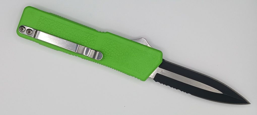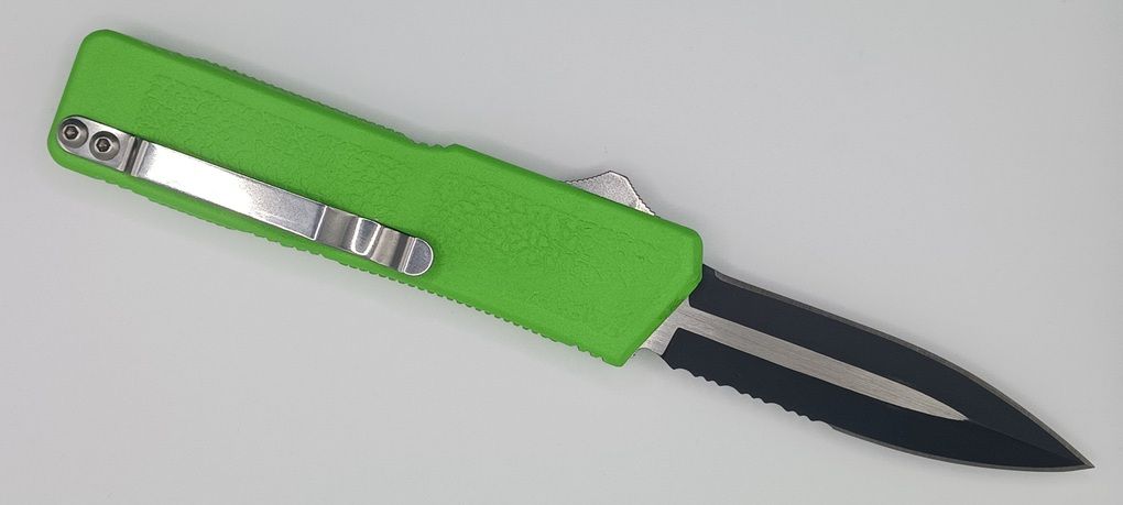 Lightning Supreme Green D/A OTF Automatic Knife Dagger Point Two Tone Serrated. The Green Lightning Supreme has an 8 inch total length with a 3.25 inch blade. It is a double action in and out switchblade knife. This is a taiwan version. The taiwan version was the first produced before the chinese versions came out. This version has aircraft aluminum handles and better made metal blades. The springs in these are made better than the chinese versions. It comes with a pocket clip which can be taken off.