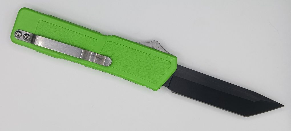 Lightning Supreme Green D/A OTF Automatic Knife Tanto Point Black Plain. The Green Lightning Supreme has an 8 inch total length with a 3.25 inch blade. It is a double action in and out switchblade knife. This is a taiwan version. The taiwan version was the first produced before the chinese versions came out. This version has aircraft aluminum handles and better made metal blades. The springs in these are made better than the chinese versions. It comes with a pocket clip which can be taken off.
