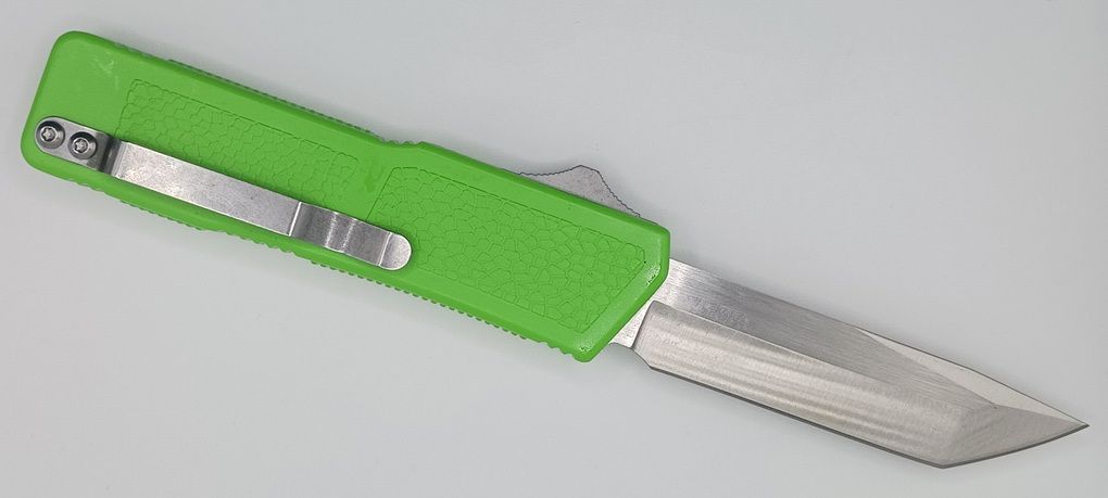 Lightning Supreme Green D/A OTF Automatic Knife Tanto Point Satin Plain. The Green Lightning Supreme has an 8 inch total length with a 3.25 inch blade. It is a double action in and out switchblade knife. This is a taiwan version. The taiwan version was the first produced before the chinese versions came out. This version has aircraft aluminum handles and better made metal blades. The springs in these are made better than the chinese versions. It comes with a pocket clip which can be taken off.