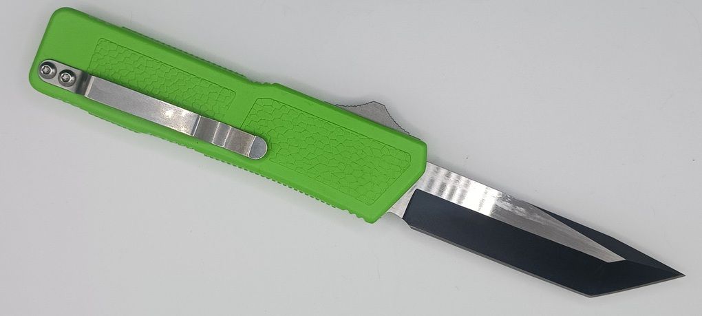Lightning Supreme Green D/A OTF Automatic Knife Tanto Point Two Tone Plain. The Green Lightning Supreme has an 8 inch total length with a 3.25 inch blade. It is a double action in and out switchblade knife. This is a taiwan version. The taiwan version was the first produced before the chinese versions came out. This version has aircraft aluminum handles and better made metal blades. The springs in these are made better than the chinese versions. It comes with a pocket clip which can be taken off.