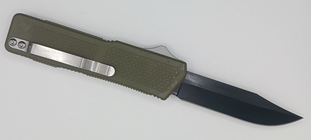 Lightning Supreme OD Green D/A OTF Automatic Knife Clip Point Black Plain. The OD Green Lightning Supreme has an 8 inch total length with a 3.25 inch blade. It is a double action in and out switchblade knife. This is a taiwan version. The taiwan version was the first produced before the chinese versions came out. This version has aircraft aluminum handles and better made metal blades. The springs in these are made better than the chinese versions. It comes with a pocket clip which can be taken off.