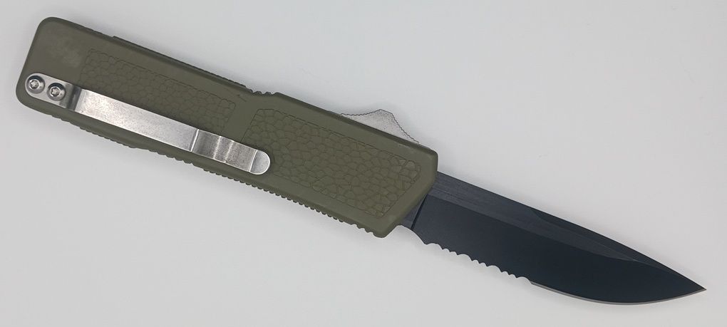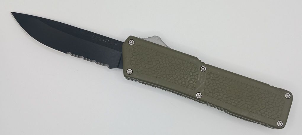 Lightning Supreme OD Green D/A OTF Automatic Knife Drop Point Black Serrated. The OD Green Lightning Supreme has an 8 inch total length with a 3.25 inch blade. It is a double action in and out switchblade knife. This is a taiwan version. The taiwan version was the first produced before the chinese versions came out. This version has aircraft aluminum handles and better made metal blades. The springs in these are made better than the chinese versions. It comes with a pocket clip which can be taken off.