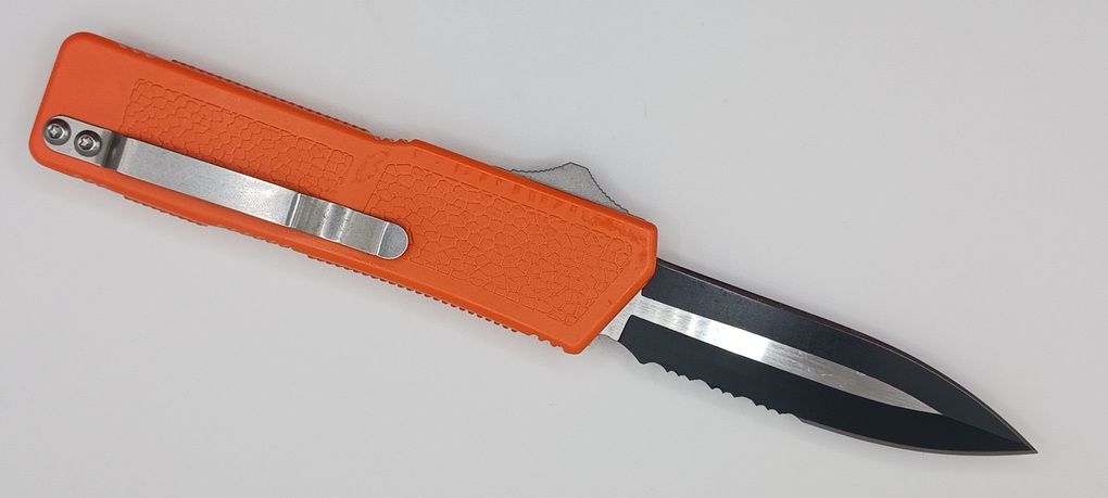 Lightning Supreme Orange D/A OTF Automatic Knife Dagger Point Two Tone Serrated. The Orange Lightning Supreme has an 8 inch total length with a 3.25 inch blade. It is a double action in and out switchblade knife. This is a taiwan version. The taiwan version was the first produced before the chinese versions came out. This version has aircraft aluminum handles and better made metal blades. The springs in these are made better than the chinese versions. It comes with a pocket clip which can be taken off.