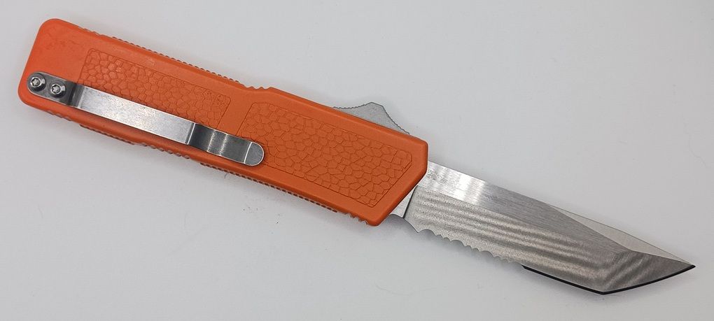Lightning Supreme Orange D/A OTF Automatic Knife Tanto Point Satin Serrated. The Orange Lightning Supreme has an 8 inch total length with a 3.25 inch blade. It is a double action in and out switchblade knife. This is a taiwan version. The taiwan version was the first produced before the chinese versions came out. This version has aircraft aluminum handles and better made metal blades. The springs in these are made better than the chinese versions. It comes with a pocket clip which can be taken off.