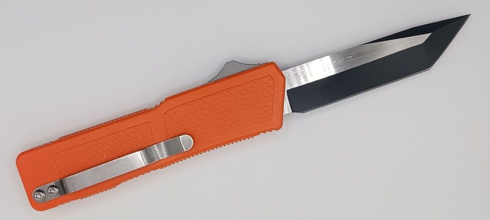 Lightning Supreme Orange D/A OTF Automatic Knife Tanto Two Tone Serrated. The Orange Lightning Supreme has an 8 inch total length with a 3.25 inch blade. It is a double action in and out switchblade knife. This is a taiwan version. The taiwan version was the first produced before the chinese versions came out. This version has aircraft aluminum handles and better made metal blades. The springs in these are made better than the chinese versions. It comes with a pocket clip which can be taken off.
