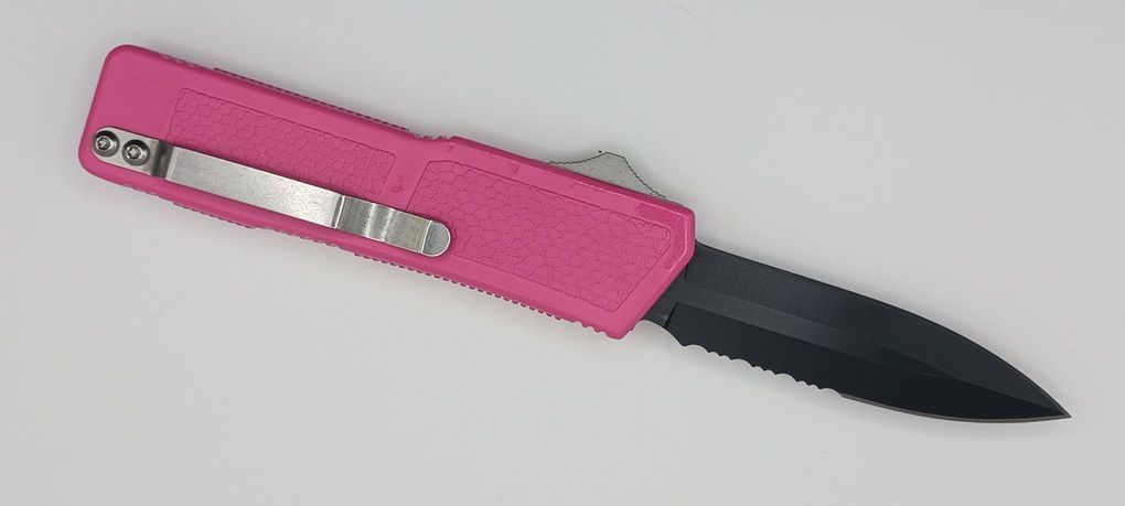 Lightning Supreme Pink D/A OTF Automatic Knife Dagger Point Black Serrated. The Pink Lightning Supreme has an 8 inch total length with a 3.25 inch blade. It is a double action in and out switchblade knife. This is a taiwan version. The taiwan version was the first produced before the chinese versions came out. This version has aircraft aluminum handles and better made metal blades. The springs in these are made better than the chinese versions. It comes with a pocket clip which can be taken off.