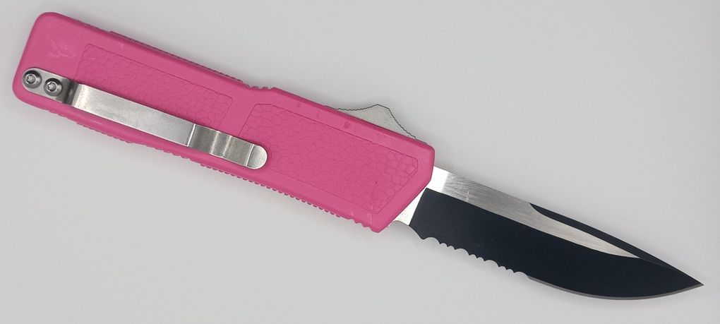 Lightning Supreme Pink D/A OTF Automatic Knife Drop Point Two Tone Serrated. The Pink Lightning Supreme has an 8 inch total length with a 3.25 inch blade. It is a double action in and out switchblade knife. This is a taiwan version. The taiwan version was the first produced before the chinese versions came out. This version has aircraft aluminum handles and better made metal blades. The springs in these are made better than the chinese versions. It comes with a pocket clip which can be taken off.