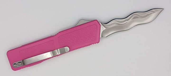 Lightning Supreme Pink D/A OTF Automatic Knife Kriss Point Satin Blade. The Pink Lightning Supreme has an 8 inch total length with a 3.25 inch blade. It is a double action in and out switchblade knife. This is a taiwan version. The taiwan version was the first produced before the chinese versions came out. This version has aircraft aluminum handles and better made metal blades. The springs in these are made better and stronger than the chinese versions. It comes with a pocket clip which can be taken off.