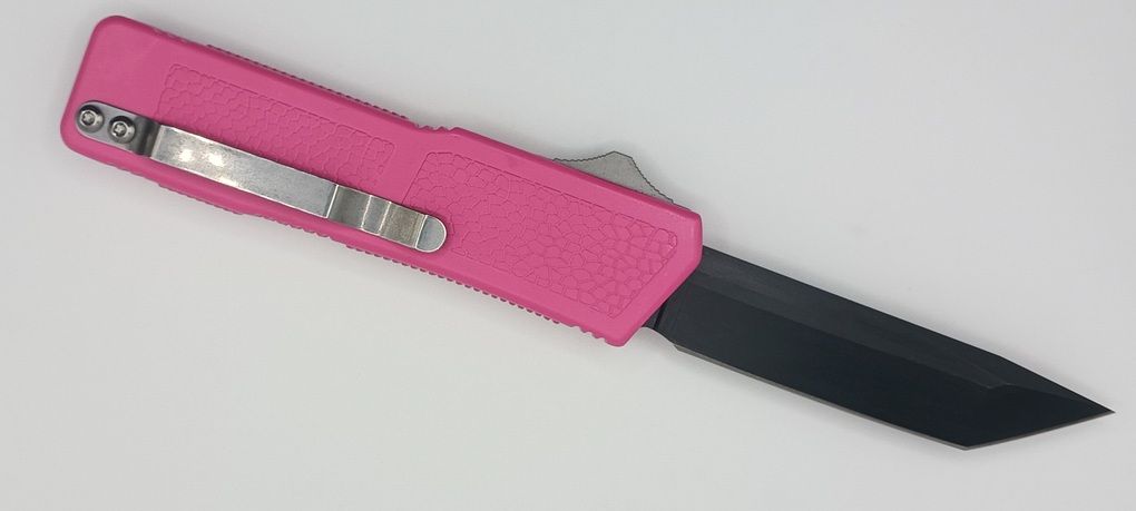 Lightning Supreme Pink D/A OTF Automatic Knife Tanto Point Black Plain. The Pink Lightning Supreme has an 8 inch total length with a 3.25 inch blade. It is a double action in and out switchblade knife. This is a taiwan version. The taiwan version was the first produced before the chinese versions came out. This version has aircraft aluminum handles and better made metal blades. The springs in these are made better than the chinese versions. It comes with a pocket clip which can be taken off.