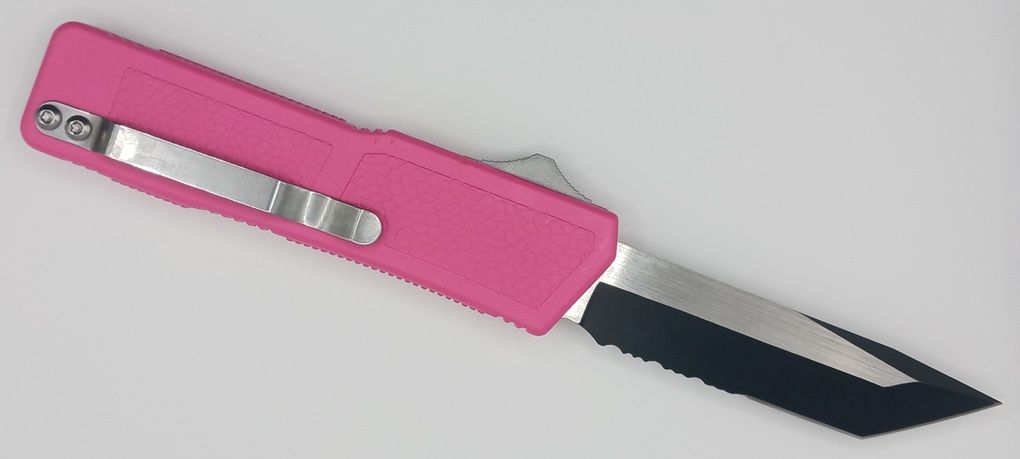Lightning Supreme Pink D/A OTF Automatic Knife Tanto Point Two Tone Serrated. The Pink Lightning Supreme has an 8 inch total length with a 3.25 inch blade. It is a double action in and out switchblade knife. This is a taiwan version. The taiwan version was the first produced before the chinese versions came out. This version has aircraft aluminum handles and better made metal blades. The springs in these are made better than the chinese versions. It comes with a pocket clip which can be taken off.