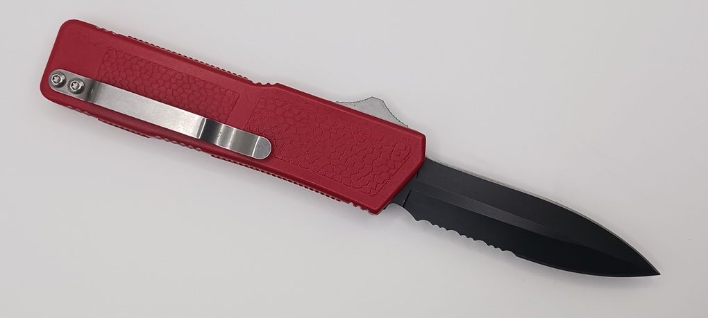 Lightning Supreme Red D/A OTF Automatic Knife Dagger Point Black Serrated. The Red Lightning Supreme has an 8 inch total length with a 3.25 inch blade. It is a double action in and out switchblade knife. This is a taiwan version. The taiwan version was the first produced before the chinese versions came out. This version has aircraft aluminum handles and better made metal blades. The springs in these are made better than the chinese versions. It comes with a pocket clip which can be taken off.