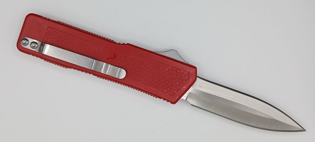 Lightning Supreme Red D/A OTF Automatic Knife Dagger Point Satin Plain. The Red Lightning Supreme has an 8 inch total length with a 3.25 inch blade. It is a double action in and out switchblade knife. This is a taiwan version. The taiwan version was the first produced before the chinese versions came out. This version has aircraft aluminum handles and better made metal blades. The springs in these are made better than the chinese versions. It comes with a pocket clip which can be taken off.