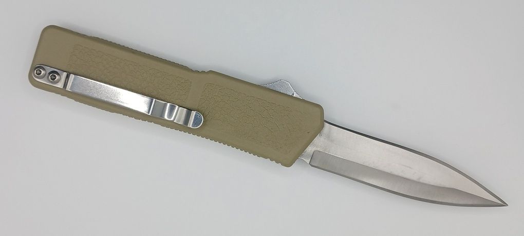 Lightning Supreme Tan D/A OTF Automatic Knife Dagger Point Satin Plain. The Tan Lightning Supreme has an 8 inch total length with a 3.25 inch blade. It is a double action in and out switchblade knife. This is a taiwan version. The taiwan version was the first produced before the chinese versions came out. This version has aircraft aluminum handles and better made metal blades. The springs in these are made better than the chinese versions. It comes with a pocket clip which can be taken off.