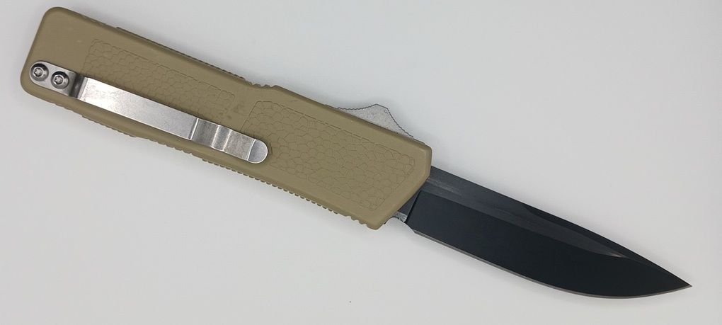 Lightning Supreme Tan D/A OTF Automatic Knife Drop Point Black Plain. The Tan Lightning Supreme has an 8 inch total length with a 3.25 inch blade. It is a double action in and out switchblade knife. This is a taiwan version. The taiwan version was the first produced before the chinese versions came out. This version has aircraft aluminum handles and better made metal blades. The springs in these are made better than the chinese versions. It comes with a pocket clip which can be taken off.