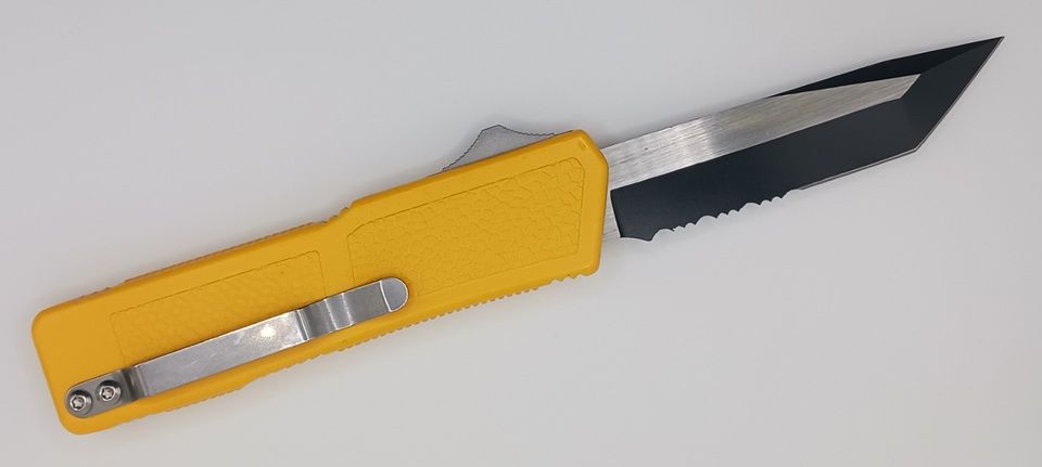 Lightning Supreme Yellow D/A OTF Automatic Knife Tanto Two Tone Serrated. The Canary Yellow Lightning Supreme has an 8 inch total length with a 3.25 inch blade. It is a double action in and out switchblade knife. This is a taiwan version. The taiwan version was the first produced before the chinese versions came out. This version has aircraft aluminum handles and better made metal blades. The springs in these are made better and stronger than the chinese versions. It comes with a pocket clip which can be taken off.