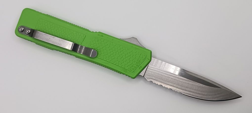 The Zombie Green Lightning Supreme has an 8 inch total length with a 3.25 inch blade. It is a double action in and out switchblade knife. This is a taiwan version. The taiwan version was the first produced before the chinese versions came out. This version has aircraft aluminum handles and better made metal blades. The springs in these are made better than the chinese versions. It comes with a pocket clip which can be taken off.