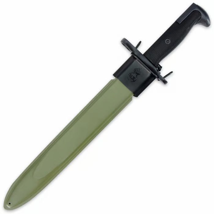 M1 Garand Bayonet Historical Replica 15". The legendary M1 Garand rifle once bore bayonets just like this historically faithful replica. It features a 9 3/4" black coated stainless steel blade and a textured handle for a slip-free grip. "US 1943" is delicately etched on the blade, and our historical reproduction includes a sturdy locking scabbard. Called "the greatest battle implement ever devised" by General Patton, the M1 Garand officially replaced the M1903 Springfield as the standard service rifle of the US Armed Forces in 1936, becoming one of the most recognized pieces of military weaponry in history. The legendary M1 Garand was used exclusively by US forces in World War II and the Korean War, and to a lesser extent in the Vietnam War. 9 3/4" black coated stainless steel blade Textured handle for slip-free grip Sturdy locking scabbard included "US 1943" historical blade etching Overall length: 15"