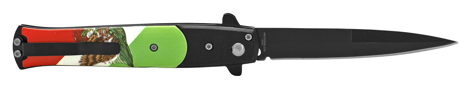 Mexico Flag 8.75" Stiletto Automatic Knife Black Bayo. Blade Material 440 Stainless Steel Blade Type Razor Folding Action Switchblade Handle Construction Stainless Steel and ABS Plastic Features Belt Clip and Safety Lock for Push Button Blade Length 3.88" Handle Length 4.88" Overall Length 8.75"