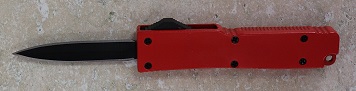 Mini Firecracker Red D/A OTF Automatic Knife Black Dagger. This California Legal OTF Knife features a durable construction aluminum finish handle with finger grip on the spine and belly with a dual action opening and closing push button. Overall 5.25 Inch Blade length of 2"