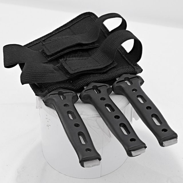 Modern Ninja Trinity Boot Knife Set 3 Piece Full Tang Throwers with Rubber Grip and Sheath. Compact and balanced, this set includes two 7.1 inches knives and one 4.8 inches knife. Crafted from heat-treated 440 stainless steel with double-edged blades and partial serrations. Non-slip rubber grips and a tactical nylon boot sheath complete the set. Specifications: Knife lengths: two at 7.1 inches; one at 4.8 inches Blade lengths: 3.75 inches (×2), 2.5 inches & 2.9 mm thick, heat-treated 440 stainless steel, double-edged, partial serrations, full tang Handle: 3.75 inches black slotted rubber grip Overall length in sheath: 8 inches Pommel: Exposed tang Accessories: Black ballistic nylon sheath with belt loop & wrap-around straps Features: 3-piece set with different blade lengths for versatility Sharp double-edged stainless steel blades Partial serrations for added cutting ability Non-slip rubber grips and full tang construction Includes boot sheath for discreet carry