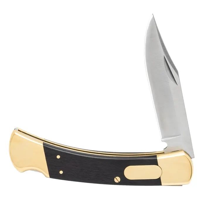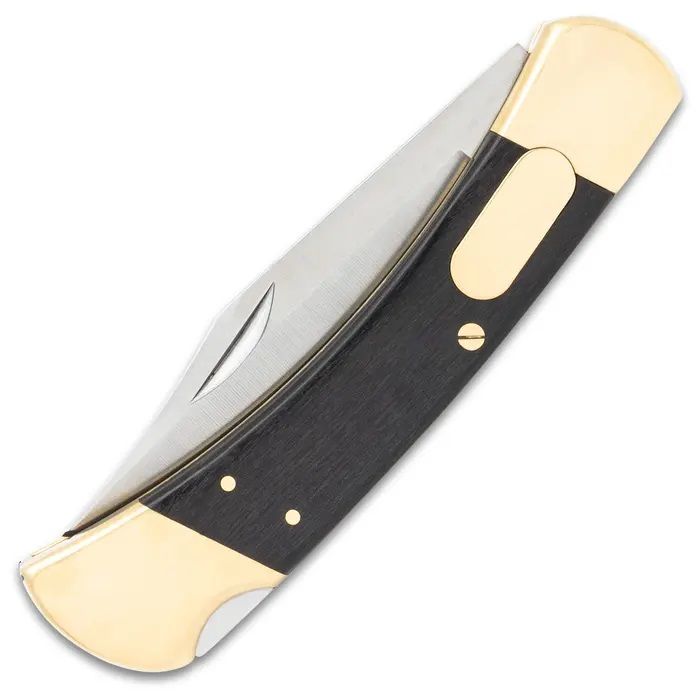 Old Fashioned Automatic Knife Lock Back Switchblade. This Automatic Pocket Knife looks as sharp in style as its blade is sharp to the touch. It has a 3 3/4” sharp, 3Cr13 stainless steel clip point blade that can be deployed with the push of the brass button. The lockback pocket knife has black wooden handle scales, secured with brass pins and bookmarked by brass bolsters. The automatic knife is 8 1/2” in overall length and is 5” when closed