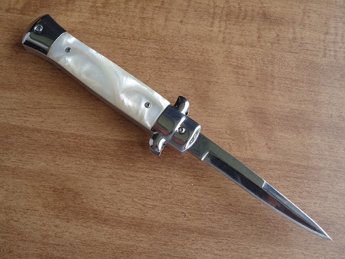 Old School 9" White Marble Stiletto D/A OTF Automatic Knife Satin Bayo. Overall Length:9.00" Blade Length:3.75" Stainless Steel. Comes with a belt sheath. Dual action in and out with the push of a button. Very strong spring action and construction without any misfires. Marked Made In Italy on the blade
