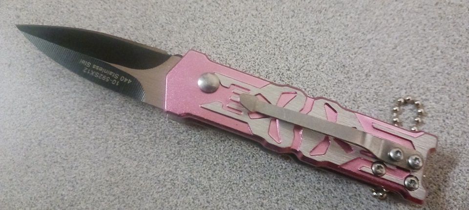 Punisher Pink Side Opening Automatic Knife Black Dagger. Specifications: Overall Length: 5.25" Closed Length: 3.25" Handle: Aluminum with key chain Blade Material: Silver stainless steel. comes with a pocket clip and safety switch