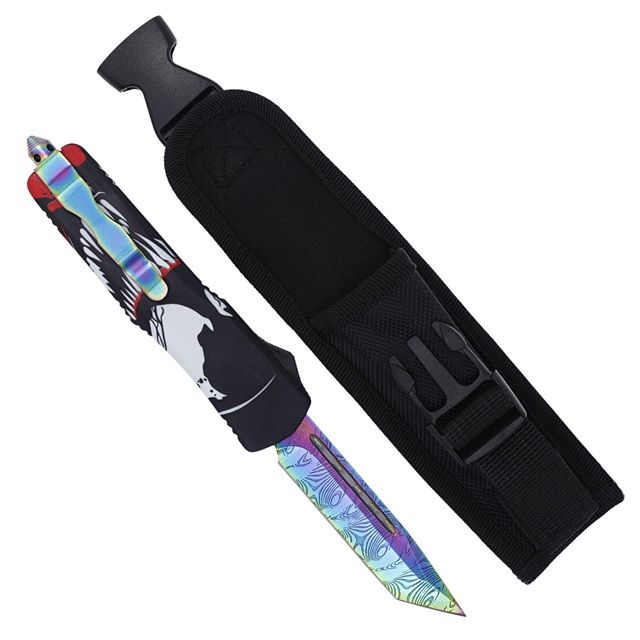 This Punisher Skull Rainbow OTF Knife combines style with function. The stainless steel blade with rainbow finish pairs with a skull-designed handle, making it stand out in any collection. Complete with a nylon sheath for secure storage and carry. Specifications: Overall Length: 9.5 inches Blade Length: 4 inches Blade Material: Stainless Steel, rainbow finish Handle: Aluminum with skull artwork Sheath: Black nylon sheath Features: Double-action OTF deployment Skull print handle design Durable rainbow-finished blade Includes sheath for easy carry