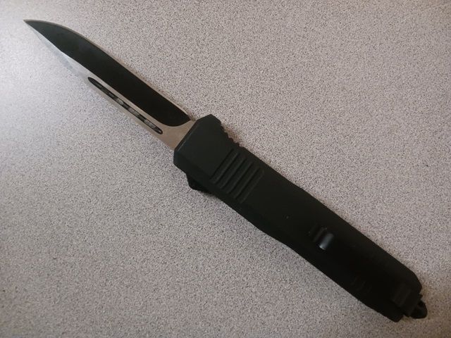 Ranger X-Large Black D/A OTF Automatic Knife Two Tone Drop Point. This out the front knife has a belt clip and a belt sheath. It weighs 5.6 ounces and is 9.75 inches with a blade length of 4 inches. It comes with a glass breaker on the end of the handle. It has a very hard in and out snap to it.