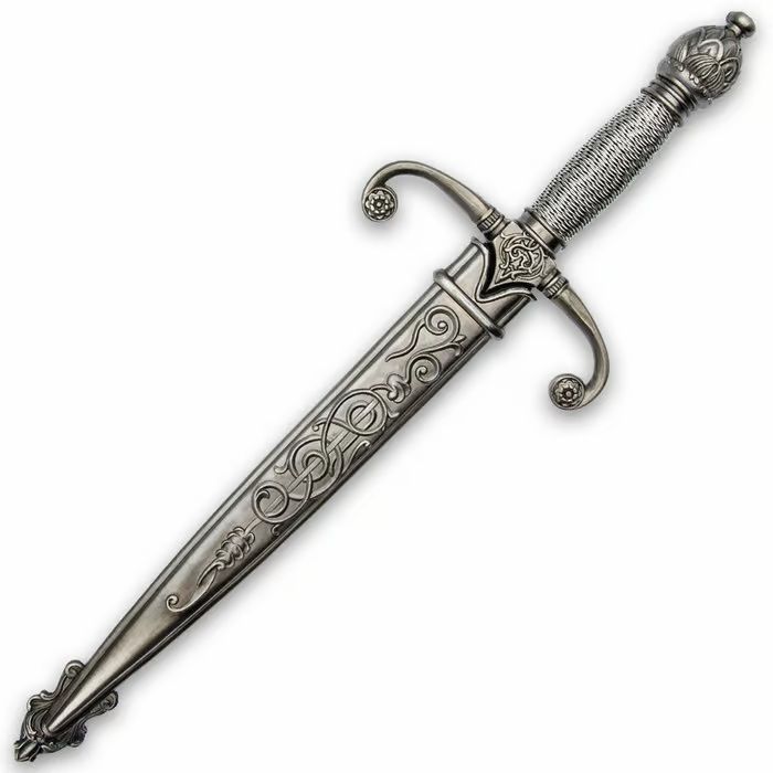 The Royal Knight's Dagger is a beautifully crafted piece that makes the perfect companion to any medieval broadsword. With its finely polished 10 1/4" stainless steel blade and intricate cast metal pommel and guard, this dagger exudes elegance and historical accuracy. The wire-wrapped handle provides an authentic medieval look while offering a secure grip, making it both a stunning display piece and a functional accessory. Complete with a matching scabbard, this dagger is ready to be tucked into your belt and taken to any royal feast or reenactment event. Whether you're a collector or a history enthusiast, this Royal Knight's Dagger offers unmatched quality and detail at an affordable price. Its timeless design and flawless construction make it a must-have addition to any medieval collection. POLISHED STAINLESS STEEL BLADE: The 10 1/4" blade is beautifully polished for a sleek, refined look. INTRICATE CAST METAL POMMEL AND GUARD: The detailed metalwork adds historical authenticity and visual appeal. WIRE-WRAPPED HANDLE: A true-to-history feature that enhances both grip and style. INCLUDES SCABBARD: Comes with a coordinating scabbard for easy carrying or display. PERFECT COMPANION BLADE: Designed to complement any medieval broadsword in your collection.