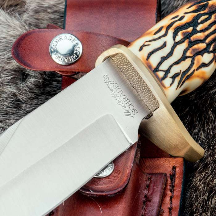 Schrade Uncle Henry Pro Hunter Hunting Knife. Tough and practical, Uncle Henry knives aren't afraid of work. From the durable handles to the classic styling they just feel good to hold. Razor-sharp 400-series stainless steel blade Handsome genuine staglon handle Includes leather sheath with sharpening stone Measures 9 7/8" overall (Half-tang blade)