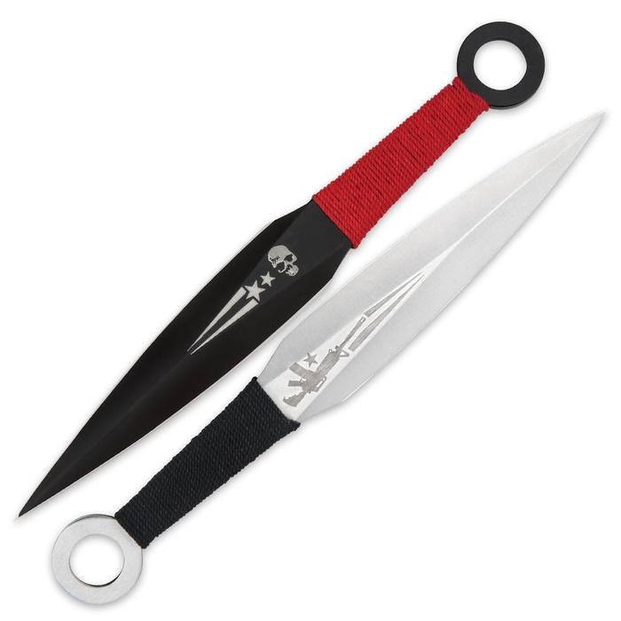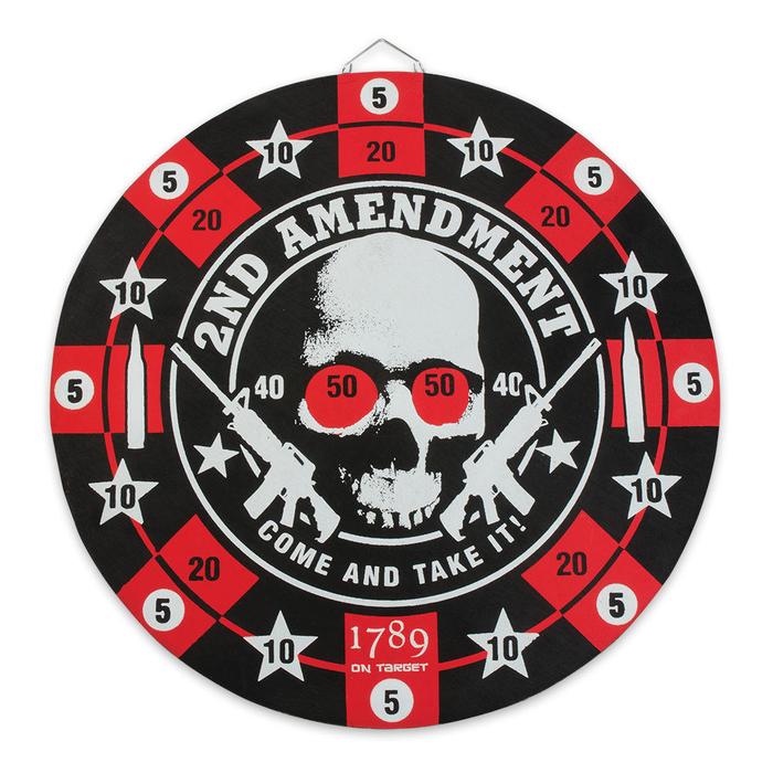 Second Amendment Target Throwing Knife Set 12 Piece. Hit your target every time with this 12-piece set of throwers AND Second Amendment themed target with custom original artwork. Each throwing knife is exquisitely designed. Perfectly balanced for an easy, accurate throw every time. 6" razor-sharp stainless steel throwers Exclusive 2nd Amendment target design Includes a custom folding nylon carrying case Instruction card with six games 12-piece set of throwers