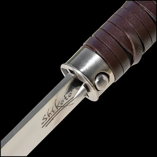 The Shikoto Gentleman's Hook Sword Cane is a refined yet functional accessory, designed to complement your attire while offering practical support. With its classic look and hidden functionality, this cane houses a 23" 1045 carbon steel blade within its sturdy wooden shaft. The blade, featuring a blood groove and a penetrating point, can be easily released with a button, seamlessly blending style and practicality. The cane’s handle has a faux wood grip, enhanced by brown leather wrapping that extends onto the shaft for added style and comfort. The hooked handle provides a solid, comfortable grip with a thumb rest for easy handling. A rubber toe at the end of the shaft ensures slip-free support, making this cane a perfect blend of elegance and discreet functionality. HIDDEN 1045 STEEL BLADE: The 23" carbon steel blade with a penetrating point and blood groove is concealed within the cane’s shaft. BUTTON BLADE RELEASE: Easily access the hidden blade with a push-button release for quick functionality. FAUX WOOD HANDLE: The stylish handle features a faux wood design with a comfortable grip, enhanced by a leather wrap for extra comfort. STURDY WOODEN SHAFT: The cane’s shaft is made from sturdy wood, featuring leather accents and a no-slip rubber toe for reliable support. ELEGANT STAINLESS STEEL DETAILS: Stainless steel accent band and blade release complement the cane’s overall sophisticated look.