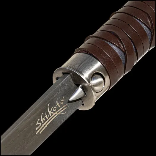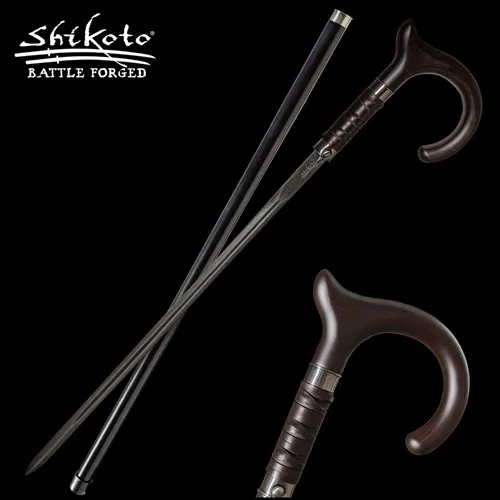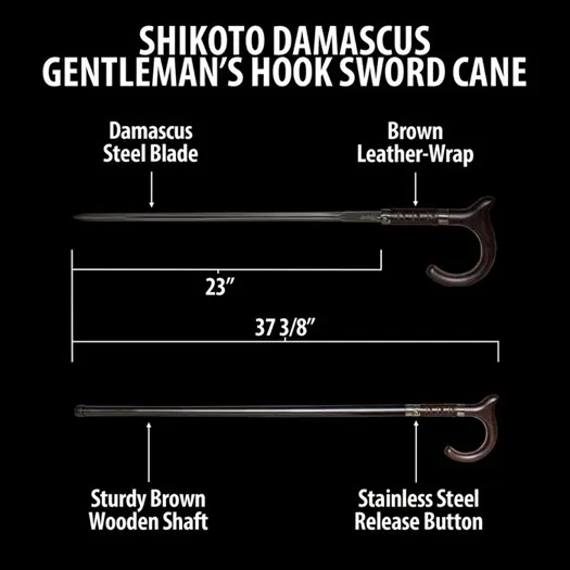 The Shikoto Gentleman's Hook Sword Cane Damascus is an elegant accessory that combines practicality with sophisticated design. Measuring 37 3/8" overall, this cane features a 23" hidden Damascus steel blade with a blood groove, renowned for its remarkable durability. The blade, concealed within the sturdy black wooden shaft, can be easily released with a push-button mechanism, offering discreet functionality. The cane's handle is styled with a faux wood grip, wrapped in black leather that extends onto the shaft for added comfort and style. The hooked design of the handle provides a secure grip, complete with a thumb rest for added stability. A stainless steel blade release and matching accent band enhance the cane's refined appearance, while a no-slip rubber toe ensures stable support on any surface. This sword cane is the perfect blend of style, functionality, and discreet protection. DAMASCUS STEEL BLADE: The 23" hidden blade is crafted from durable Damascus steel, featuring a blood groove for added strength and sharpness. PUSH-BUTTON BLADE RELEASE: Easily release the hidden blade with a convenient stainless steel push-button mechanism. HOOKED HANDLE DESIGN: The faux wood handle is wrapped in black leather and includes a thumb rest for a comfortable, secure grip. STURDY WOODEN SHAFT: The black wooden shaft provides a solid structure, accented with genuine leather wrap and a stainless steel band for added style. NO-SLIP RUBBER TOE: The base of the cane is fitted with a rubber toe to ensure slip-free support on various surfaces.