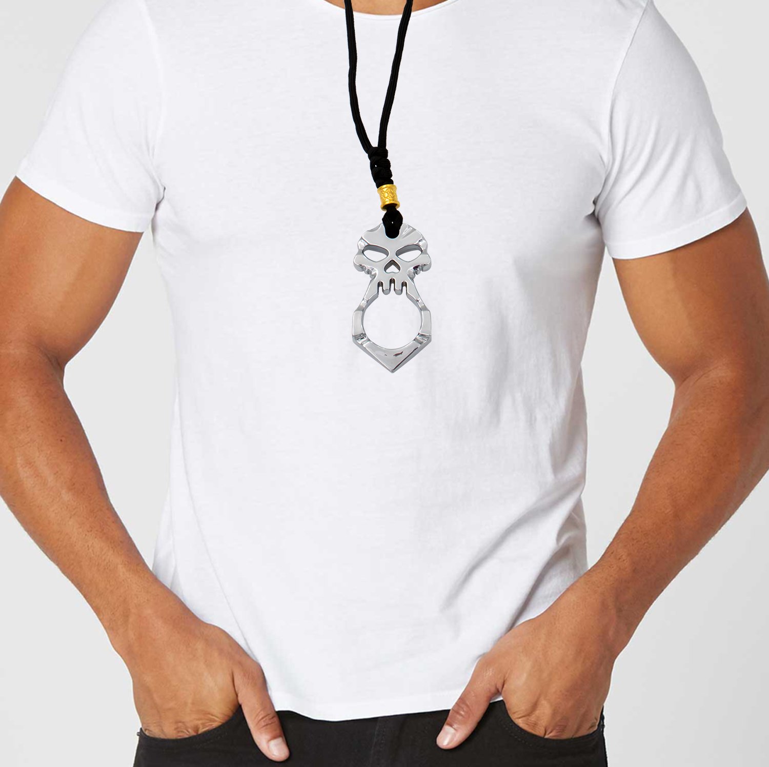 Skull Knuckle Lanyard Necklace One Finger Silver Large. Weighs in at 3.10 ounces Skull has a length of 2.95 inches Includes 15 inch paracord lanyard with a steel, decorated encasing Detailed skull shape and look Unique keychain and self defense tool