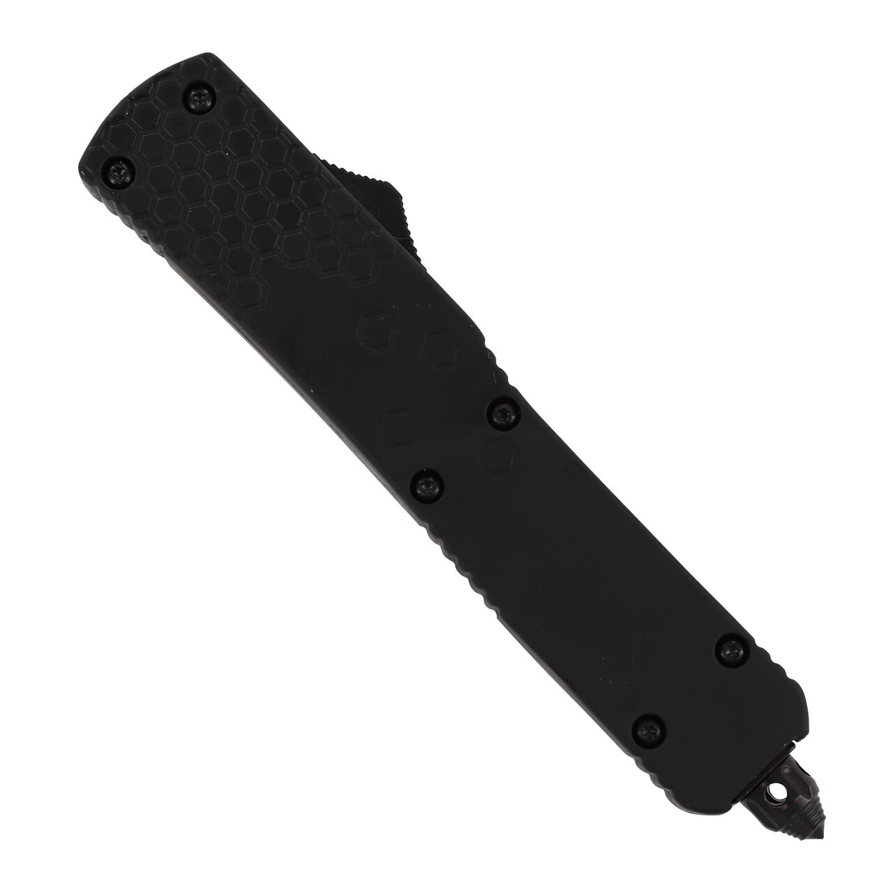 Slim Line Black D/A OTF Automatic Knife Tanto 2 Tone Serrated. The handle is constructed of zinc alloy and features a matte black finish. A glass breaker and pocket clip on handle, black nylon sheath. Overall Length: 8.375 inches, Blade Length: 3.25 inches