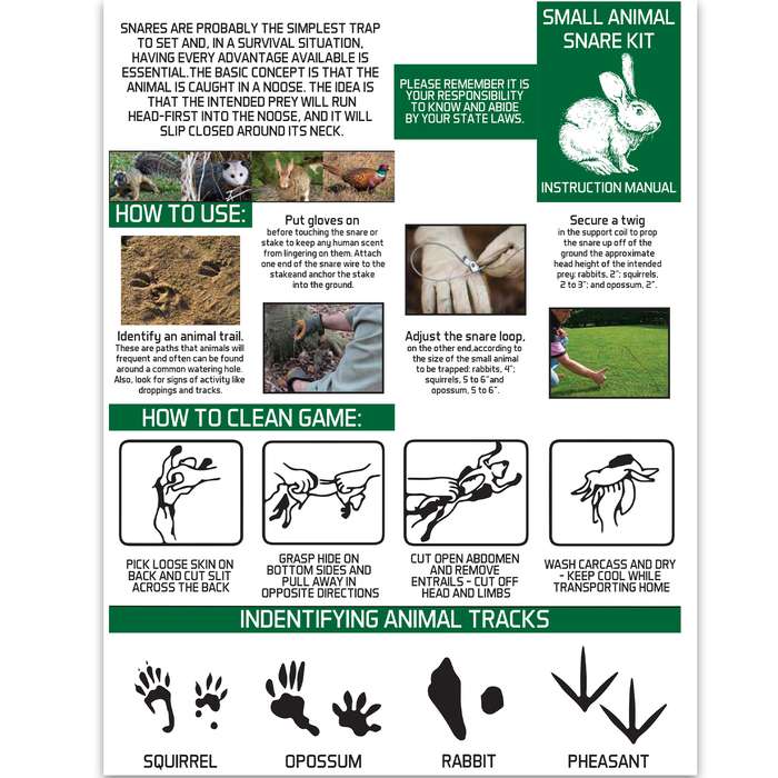 Small Animal Survival Snare Kit. This snare kit will capture small animals like rabbits and squirrels, as well as, larger animals like groundhog or woodchuck Made with 36” of 7x7 strand 1/16” cable, it offers 480 lbs of holding strength and features a lock to assure a firm hold There are three snares in the package and instructions Download free e-book manual