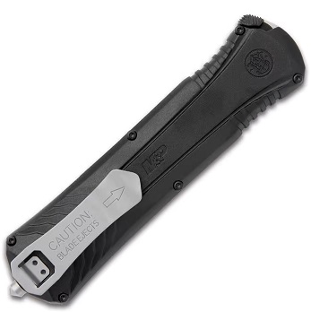 The Bead Blasted Pocket Knife from Smith & Wesson is an assisted opening OTF that was built with tactical intent in mind The 3 1/2”, AUS-8 stainless steel blade is forged into a double-edged spear point, and it has a bead-blasted finish The aluminum handles are contoured for a better grip and include a glass breaker pommel, a pocket clip, and a safety lock The OTF pocket knife has a safety and a tab on the side used to retract the blade, in addition to, the thumb slide