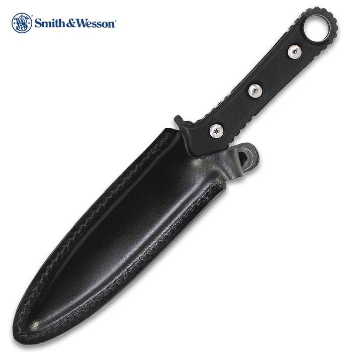 Smith & Wesson Boot Knife Stonewash Dagger. You have the confidence that the blade will not slip with the security of the finger guards and the integrated finger hole The 4 2/5”, dual-edged, spear point blade is made of 8Cr13MoV high carbon stainless steel and features a stonewashed finish The non-reflective, black thermoplastic elastomer handle scales feature heavy pommel jimping and a lanyard hole The boot knife is 8 3/5” in length and the leather boot or belt sheath gives you quick and easy access making it ideal for EDC