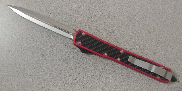 Special 10" Red Carbon D/A OTF Automatic Knife Satin Dagger. 10 inch total length 4.25" 440 stainless steel blade. It comes with a glass breaker on the end of the handle, a belt sheath and a pocket clip. Very strong spring action in and out with the push of the button.