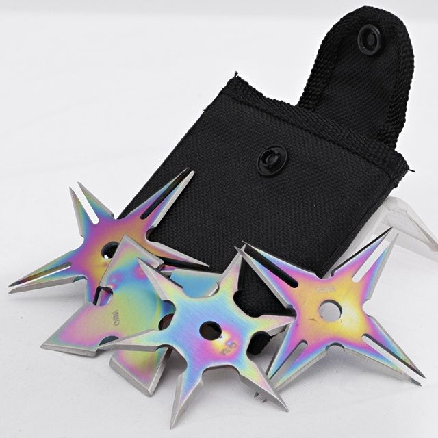 Stainless Steel 4 Piece Rainbow Ninja Throwing Stars Set with Nylon Pouch. This ninja throwing star set includes a 6-point, a 5-point, and two 4-point shuriken crafted from sharp 440 stainless steel with a vibrant titanium rainbow coating. Includes a folding nylon pouch for storage and carry. Specifications: Star diameter: 2.5″ each Blade: 440 stainless steel, titanium rainbow heat-treated finish, 2 mm thick, very sharp Pouch size folded: 3″ × 2.75″; unfolded: 11.5″ × 3″ Set: 1 × 6-point, 1 × 5-point, 2 × 4-point stars Accessories: Black nylon pouch with snap closure Features: Set of 4 ninja throwing stars in mixed styles Eye-catching titanium rainbow finish Durable stainless steel construction Compact nylon pouch keeps stars secure Perfect for display, collection, or martial arts practice