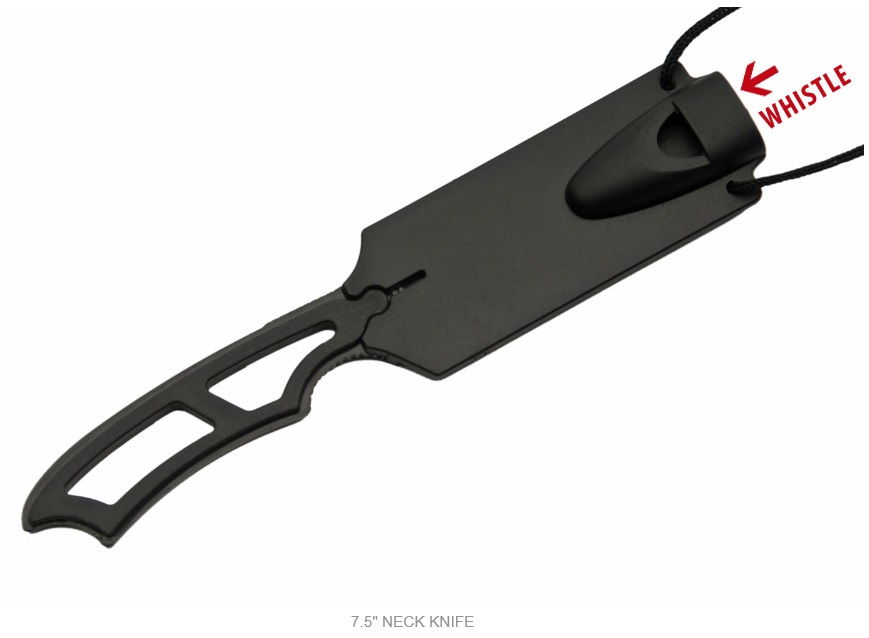 Street Protection 7.5 Inch Black Neck Knife Black Tanto. 7.5" overall length 420 stainless steel black ABS handle hard sheath with neck lanyard and whistle.